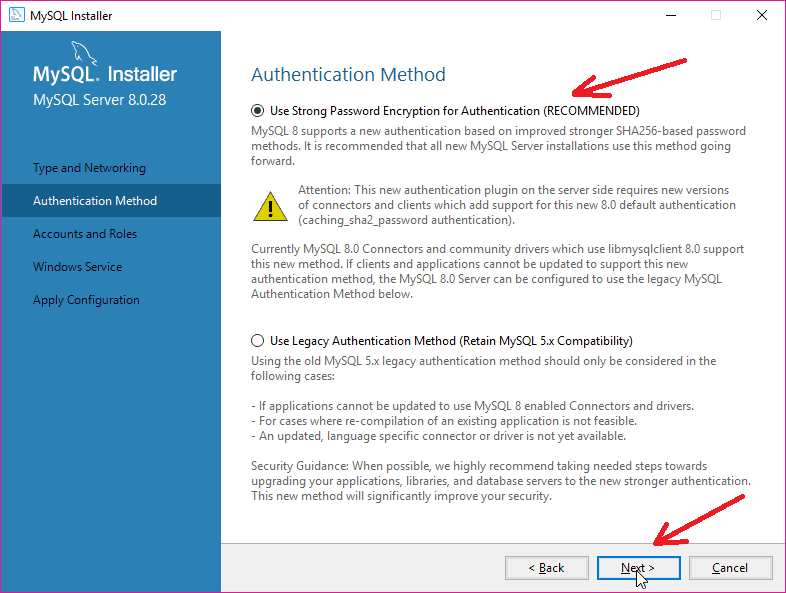 - Select “Use Strong Password Encryption for Authentication.” as it is based on improved stronger SHA256-based password methods, and it is also recommended that all new MySQL server installations use this method going forward.