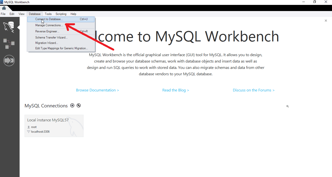 - Open MySQL WorkBench and then go to Database>Connect to Database.